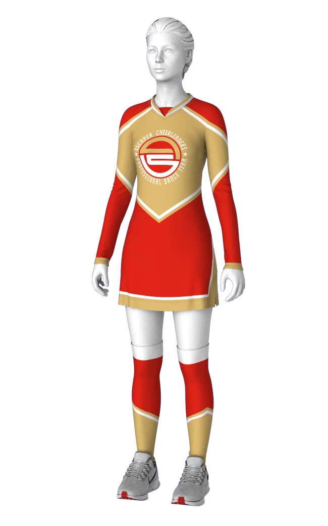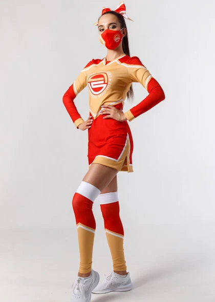 EscaperОписание: Женский комплект для чирлидинга: платье и шорты. Платье приталенное, немного расширено к низу, с боковыми разрезами. Рукав длинный втачной без манжеты. V-образная горловина с мысиком. Шортики отдельно, не вышиты. Полная сублимация — любой цвет и дизайн (уже входит в стоимость). Можно дополнить бантом и гетрами.